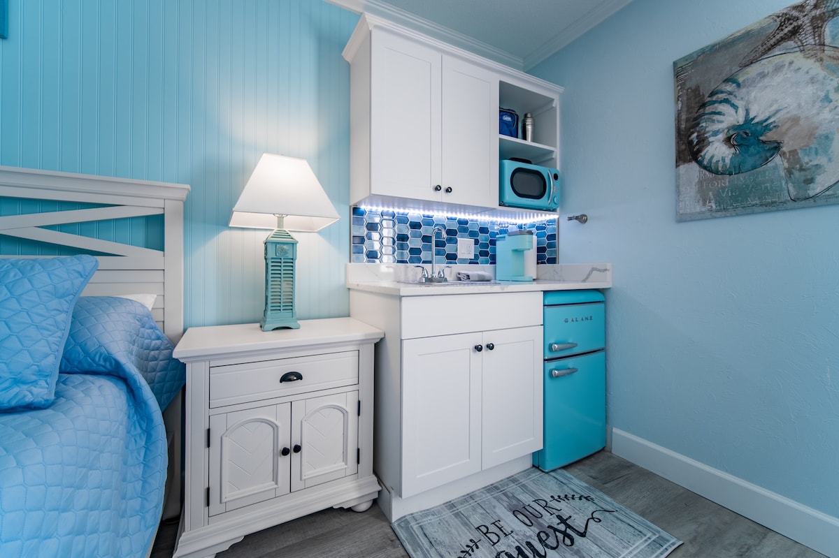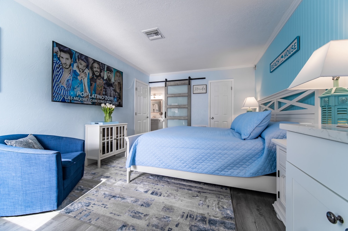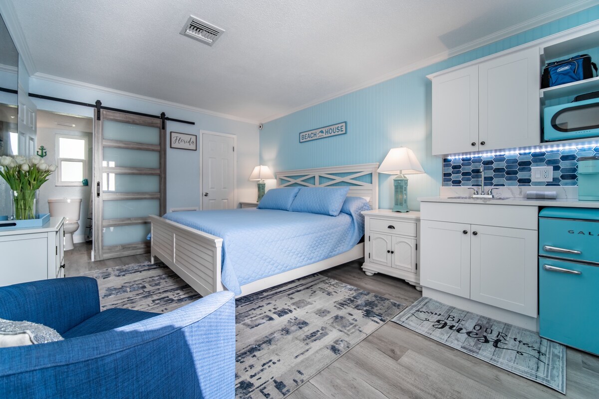 The studio offers a king sized bed, 70 inch TV w/ cable & smart apps, a kitchenette w/ Keurig, toaster, microwave, mini fridge, freezer & more.